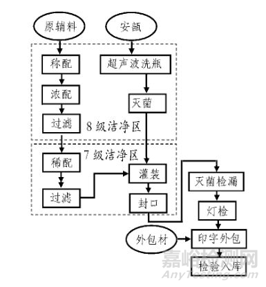 安瓿瓶經(jīng)超聲波清洗、多針水汽交替清洗、熱層流滅菌、層流凈化,經(jīng)多針灌裝稀配藥液后,拉絲封口,再經(jīng)水浴式滅菌柜滅菌、燈檢合格后外包入庫,其工藝流程框圖見圖1。