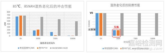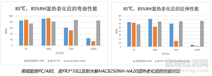 我們還耐濕熱老化性能試驗(yàn)中發(fā)現(xiàn),常規(guī)阻燃PC/ABS,在85°C/85%RH條件下,阻燃/沖擊/拉伸強(qiáng)度/彎曲強(qiáng)度等性能會(huì)在在300h后急劇下降,還會(huì)出現(xiàn)明顯的脆化現(xiàn)象。(詳細(xì)實(shí)驗(yàn)數(shù)據(jù)見(jiàn)后)
