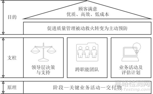 領(lǐng)導(dǎo)層決策與支持強(qiáng)調(diào)理解并保證項目目標(biāo),提供資源支持,激勵團(tuán)隊提升等;跨職能團(tuán)隊強(qiáng)調(diào)項目推進(jìn)需要多專業(yè)、多部門協(xié)同配合,促進(jìn)質(zhì)量要求在各個環(huán)節(jié)有效傳遞;業(yè)務(wù)活動及評估計劃強(qiáng)調(diào)項目實施的各階段有明確的時間進(jìn)度表,并持續(xù)監(jiān)控、移除風(fēng)險。在三個支柱中領(lǐng)導(dǎo)層作用尤為重要,文獻(xiàn)指出,質(zhì)量產(chǎn)生于高層,質(zhì)量只有在高層管理指導(dǎo)下,才能做得最好。