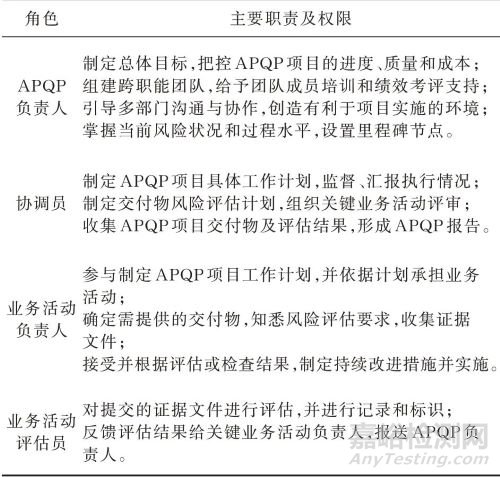 APQP是一個團(tuán)隊導(dǎo)向的合作過程,要求在有限時間內(nèi)完成明確的業(yè)務(wù)活動,因此,搭建跨職能團(tuán)隊的組織架構(gòu)尤為重要。MAFA-APQP按職責(zé)定義了項目負(fù)責(zé)人、協(xié)調(diào)員、業(yè)務(wù)活動負(fù)責(zé)人以及業(yè)務(wù)活動評估員等角色,如圖3所示。成員涉及管理、工藝、質(zhì)量、生產(chǎn)、檢驗等,必要時還應(yīng)邀請顧客代表參與。另外,MAFA-APQP明確了各角色的主要職責(zé)和權(quán)限,如表1所示。