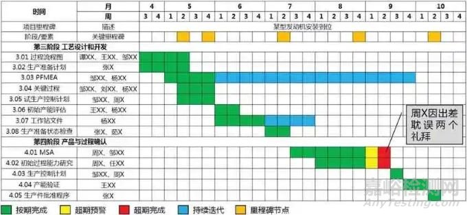 MAFA-APQP 要素之間根據(jù)輸入輸出關(guān)系,在軍用飛機(jī)總裝流程中構(gòu)成了一個完整的質(zhì)量工作鏈條,能夠有效保證質(zhì)量工作的一致性和連貫性,而交付物是MAFA-APQP 要素已完成的切實證據(jù)。因此,MAFA-APQP的核心觀點(diǎn)是任何一個產(chǎn)品模塊(指產(chǎn)品分解結(jié)構(gòu)PBS中確定的模塊)的實施,都應(yīng)創(chuàng)建一個要素計劃表,并考慮納入質(zhì)量保證大綱。其目的是保證整個關(guān)鍵業(yè)務(wù)活動在實施周期內(nèi)依計劃開展,要素計劃表中應(yīng)有質(zhì)量記錄,狀態(tài)標(biāo)色并說明原因,重點(diǎn)檢查轉(zhuǎn)節(jié)點(diǎn)和關(guān)鍵里程碑。以某型發(fā)動機(jī)安裝為例,要素計劃表如圖4所示。
