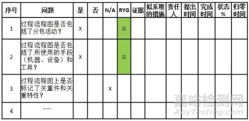 要素計劃表應(yīng)由跨職能團(tuán)隊共同制定并達(dá)成一致,一經(jīng)確認(rèn)便不可隨意更改。另外,要素計劃表中的時間顆粒度可根據(jù)生產(chǎn)需要確定為周、天或小時等。MAFA-APQP 實施過程強(qiáng)調(diào)不斷加強(qiáng)過程風(fēng)險識別和緩解,因此,每個交付物都應(yīng)有一個關(guān)聯(lián)的要素檢查表,由簡短的、清晰的、封閉式的問題組成,通過使用要素檢查表來評估交付物質(zhì)量,并記錄糾正偏差的措施。要素檢查表樣表如圖5所示。
