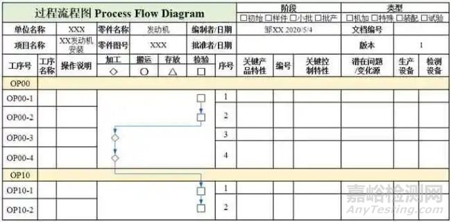 流程優(yōu)化是在現(xiàn)有基礎(chǔ)上對流程進(jìn)行梳理、完善,重點(diǎn)強(qiáng)調(diào)改良,可以對流程整體優(yōu)化,也可對其中部分進(jìn)行改進(jìn)。MAFA-APQP的重要觀點(diǎn)是過程流程圖(3.01 PFD)是第三階段所有關(guān)鍵業(yè)務(wù)活動的基礎(chǔ)輸入,應(yīng)包含所有替代過程、關(guān)鍵特性、關(guān)鍵項目等。PFD采用圖形化清晰、完整地描述發(fā)動機(jī)安裝過程按順序排列的操作,覆蓋接收、安裝、檢查、測試、保護(hù)、存儲和搬運(yùn)等步驟的詳細(xì)描述,利用PFD整合安裝流程時,應(yīng)與實際工藝路線保持一致,且強(qiáng)調(diào)總的過程而不是單個步驟。過程流程圖樣表如圖6 所示。
