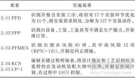 MAFA-APQP要求CP應(yīng)列出在發(fā)動機(jī)安裝過程中需要監(jiān)視的關(guān)重特性(3.04 KCS)以及相應(yīng)的控制方法,并規(guī)定在過程不穩(wěn)定或不合格發(fā)生時的應(yīng)對計劃。軍用飛機(jī)關(guān)重特性一般由設(shè)計直接給出,包括產(chǎn)品關(guān)重特性和控制關(guān)鍵特性,標(biāo)注為GT/ZT。此外,經(jīng)PFMEA 識別或顧客要求的關(guān)重特性也應(yīng)納入控制計劃、作業(yè)指導(dǎo)書等進(jìn)行波動控制。PFMEA 和CP的核心作用是最大限度地減少過程和產(chǎn)品變差,且均為動態(tài)文件,應(yīng)在整個發(fā)動機(jī)安裝生命周期內(nèi)被維護(hù)并使用。要素實施結(jié)果如表3所示。
