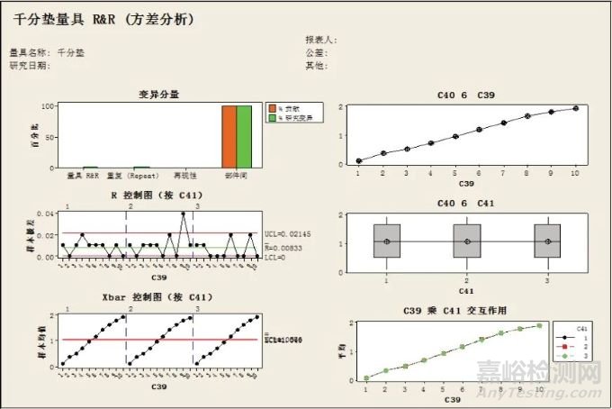 軍用飛機(jī)總裝階段存在的典型問題是測量環(huán)節(jié)薄弱,不會測、測不準(zhǔn),導(dǎo)致部分失效發(fā)生時找不到原因或測量數(shù)據(jù)無法有效分析裝配過程狀態(tài)、過程能力以及監(jiān)控過程變化,因此,測量系統(tǒng)分析(4.01 MSA)是保證測量數(shù)據(jù)及結(jié)論有效性的基礎(chǔ)。發(fā)動機(jī)安裝需要測量的特性參數(shù)主要有擰緊力矩、關(guān)鍵間隙、階差等,測量過程所用到的測量方法、軟硬件以及測量人員的集合稱為測量系統(tǒng)。MAFA-APQP 要求CP 中的KCS 都應(yīng)做測量系統(tǒng)分析。MSA 通常使用數(shù)理統(tǒng)計和圖表的方法對測量系統(tǒng)的分辨率和誤差進(jìn)行分析,以評估被測參數(shù)的可接受性。以發(fā)動機(jī)間隙測量常用量具鋼板尺和千分墊為例,GR&R 方差分析如圖7~圖8 所示,可以看出:%SV 均小于10%且可區(qū)分?jǐn)?shù)均大于4,表示測量系統(tǒng)可接受,測量數(shù)據(jù)可用。