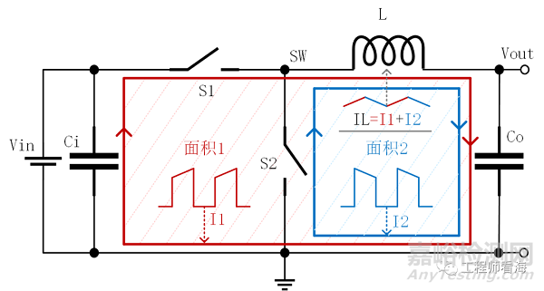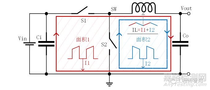 狀態(tài)1:當(dāng)S1導(dǎo)通、S2斷開時,電流流經(jīng)的回路如圖中紅色的環(huán)路1(Ci->S1->L->Co)所示,流過紅色環(huán)路1的電流I1是離散的脈沖式電流;