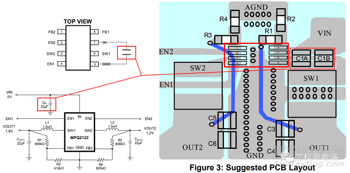以雙路降壓BUCK電源(轉(zhuǎn)換器)MPQ2122為例,推薦的PCB layout布局將輸入電容盡可能近地靠近芯片的IN和GND引腳,從而減小輸入環(huán)路面積,降低EMI噪聲。