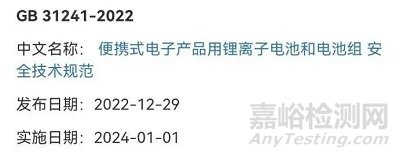 2022年12月29日國家市場監(jiān)督管理總局(國家標(biāo)準(zhǔn)化管理委員會)發(fā)布的中華人民共和國國家標(biāo)準(zhǔn)公告(2022 年第 19 號),GB 31241-2022《便攜式電子產(chǎn)品用鋰離子電池和電池組 安全技術(shù)規(guī)范》正式發(fā)布!