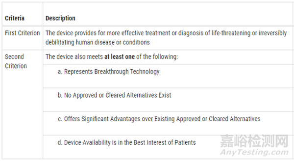 申請(qǐng)上市前批準(zhǔn)(PMA)、上市前通告 (510(k)) 或 De Novo指定的器械產(chǎn)品,需同時(shí)符合以下兩個(gè)條件:一是該器械可治療或診斷危害生命的疾病。二是該器械應(yīng)滿(mǎn)足以下至少一項(xiàng):a.代表突破性技術(shù)b.無(wú)已批上市替代產(chǎn)品c.與現(xiàn)有或已批準(zhǔn)的替代產(chǎn)品相比具有顯著優(yōu)勢(shì)d.器械可及性符合患者最大利益。