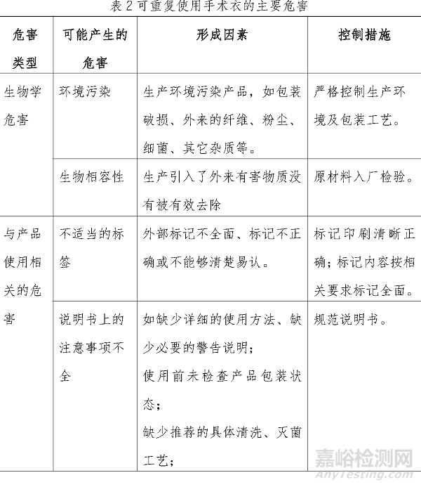 以下依據(jù)YY/T 0316 的附錄D從三個(gè)方面列舉了可重復(fù)使用手術(shù)衣產(chǎn)品的危害因素,提示審查人員從以下方面考慮。