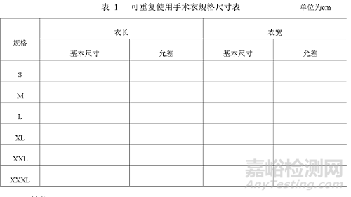 (注:常用手術(shù)衣的規(guī)格示例參見YY/TO506.8-2019 附錄B,申請(qǐng)人應(yīng)明確給出申報(bào)產(chǎn)品所包含的規(guī)格尺寸和允差要求)