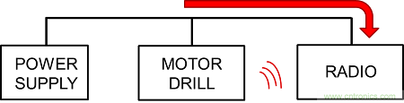 EMI可能會以兩種方式顯現(xiàn)。例如連接相同電源供應(yīng)器的無線電和電機(jī)鉆就是一例,如圖2所示。在本例中,敏感無線電系統(tǒng)的運(yùn)作會透過傳導(dǎo)方式受到電機(jī)影響,因?yàn)檫@兩者共享相同的電源插座。電機(jī)也會透過電磁輻射對無線電的功能造成影響,因?yàn)榍笆鲭姶泡椛鋾高^空氣耦合,并受到無線電天線接收。