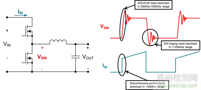如圖4所示,在SMPS中進(jìn)行切換的本質(zhì),會導(dǎo)致產(chǎn)生非連續(xù)輸入電流、在切換節(jié)點(diǎn)的高邊緣速率,以及電源回路中因寄生電感而在切換邊緣產(chǎn)生的其他振鈴。非連續(xù)電流會影響< 30MHz頻段的EMI,而在切換節(jié)點(diǎn)的高邊緣速率以及振鈴則會影響30~100MHz頻段的EMI,以及> 100MHz頻段的EMI。