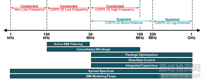 用于限制干擾的規(guī)定采用業(yè)界標(biāo)準(zhǔn)規(guī)格建立,例如適用汽車產(chǎn)業(yè)的國際無線電干擾特別委員會(CISPR) 25,以及適用多媒體設(shè)備的CISPR 32。CISPR標(biāo)準(zhǔn)是EMI設(shè)計(jì)的重要關(guān)鍵,因其可決定任何EMI降低技術(shù)的目標(biāo)性能。CISPR標(biāo)準(zhǔn)可根據(jù)干擾模式分類為傳導(dǎo)式限制和輻射式限制,如圖3所示。圖3圖表中的長條代表最大的傳導(dǎo)式和輻射式排放限制,這是使用標(biāo)準(zhǔn)EMI測量設(shè)備進(jìn)行測量時(shí),受測設(shè)備所能容許的上限。