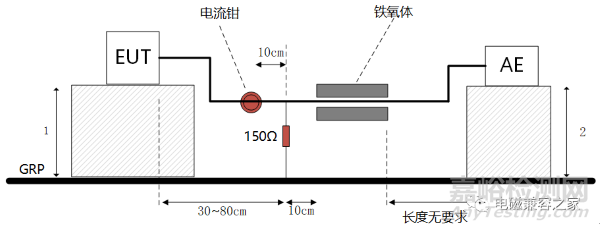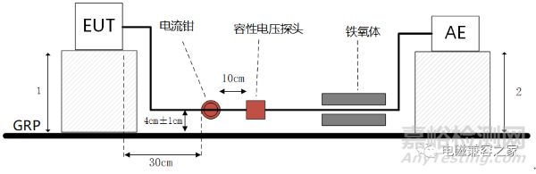 屏蔽層與GRP通過150歐姆電阻連接,連接線長度不大于30cm??拷麬E端使用鐵氧體以提供足夠大的共模阻抗。在距離連接點10cm處用電流探頭進行電流測量,電流探頭把磁場轉(zhuǎn)化成相應(yīng)的電壓信號,傳輸至接收機,測量軟件通過電流探頭轉(zhuǎn)換系數(shù)將接收到的電壓轉(zhuǎn)換為電流,即可得到不同頻率上干擾電流的幅度值。最終測量值與電流限值比較,判斷是否符合標(biāo)準(zhǔn)法規(guī)要求。