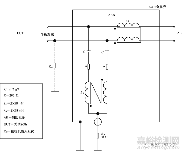 對于1對非屏蔽平衡線(如xDSL)可采用圖2結(jié)構(gòu)的ISN進行電信端口傳導(dǎo)騷擾電壓的測量。