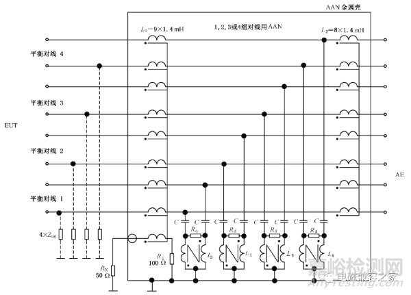 除了上述結(jié)構(gòu)的ISN之外,可采用圖7高LCL結(jié)構(gòu)的ISN進行多對非屏蔽平衡線電信端口的測量,此種類型的ISN可兼顧1對~4對平衡線的測量,也是當(dāng)今最主流的ISN。