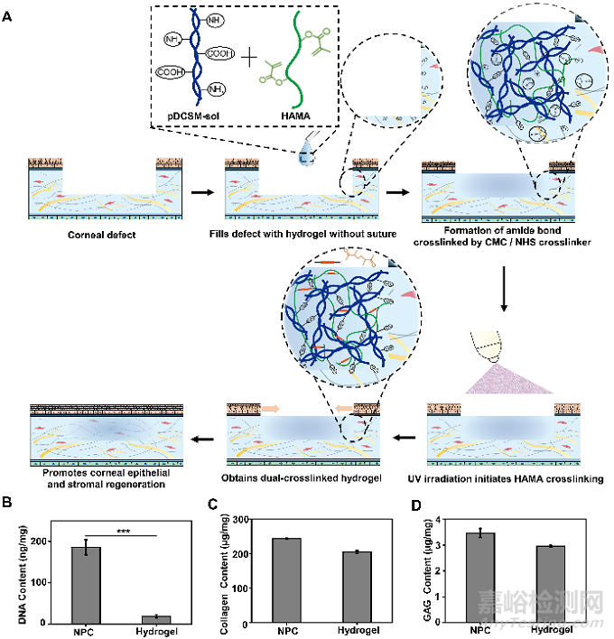 Fig. 1. Application, synthesis, and biomolecular compositions of hydrogels. (A) Schematic illustrations of the hybrid hydrogel applied onto corneal defect in situ for long-term regenerative repair. Quantitative analysis of the (B) DNA, (C) collagen, and (D) GAG contents in the NPCs and those retained in the pDCSM-G, respectively. (***, P<0.001).