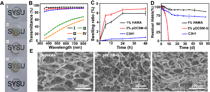 Fig. 2. Optical, swelling, degradation, and microscopic characterizations of the hydrogels. (A) Photographs of the prepared hydrogel specimens (thickness ~ 1 mm) placed on an "SYSU"-labelled paper. The five hydrogel specimens were, (I) photocrosslinked 1% HAMA, (II) physically crosslinked 3% pDCSM-G without CMC/NHS at 37°C, (III) CMC/NHS crosslinked 3% pDCSM-G, (IV) photocrosslinked C3H1 hybrid hydrogel without CMC/NHS at 37°C, and (V) dual-crosslinked C3H1 hydrogel. (B) Light transmittance of the abovementioned five hydrogel specimens on visible light spectrum. (C) Swelling ratios of the photocrosslinked 1% HAMA, CMC/NHS crosslinked 3% pDCSM-G, and dual-crosslinked C3H1 hydrogels when immersed in PBS solution at 37°C in PBS solution within two days, respectively. (D) Long-term degradation behavior of the photocrosslinked 1% HAMA, CMC/NHS crosslinked 3% pDCSM-G, and dual-crosslinked C3H1 hydrogels in 5U/mL collagenase type I solution at 37°C within 60 days, respectively. (E) SEM micrographs of the lyophilized photocrosslinked 1% HAMA, CMC/NHS crosslinked 3% pDCSM-G, and dual-crosslinked C3H1 hydrogels.