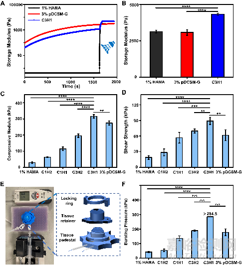 Fig. 3. Mechanical characterizations of the chemically crosslinked hydrogels. (A) Rheological characterization of the photocrosslinked 1% HAMA, CMC/NHS crosslinked 3% pDCSM-G, and dual-crosslinked C3H1 hydrogel before and after light exposure. (B) storage moduli of the 1% HAMA, 3% pDCSM-G, and C3H1 hydrogels after chemical crosslinking, characterized by rheometry. (C) Compressive moduli of the hydrogels with different compositions of HAMA and pDCSM-G. (D) Shear strength of the hydrogels with different compositions of HAMA and pDCSM-G. (E) Photograph of the artificial anterior chamber device used for bursting pressure tests. (F) Averaged bursting pressures of the hydrogels with different compositions of HAMA and pDCSM-G. (**P<0.01, ***P<0.001, ****P<0.0001)