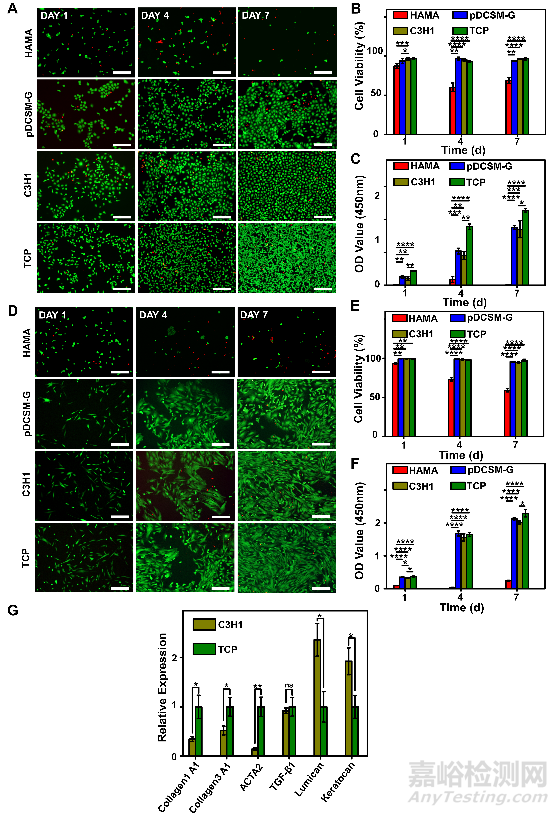 Fig. 4. Corneal epithelial cells and corneal stromal cells cultured on the HAMA, pDCSM-G, C3H1 hydrogels, and TCP. (A) Live/Dead staining of corneal epithelial cells cultured on 1% HAMA, 3% pDCSM-G, C3H1 hydrogel, and TCP for 1, 4, and 7 days, respectively. Scale bars = 200 μm. (B) Quantification of the corneal epithelial cells viability on hydrogels and TCP characterized by Live/Dead assay. (C) CCK-8 assay of the cultured corneal epithelial cells after 1, 4, and 7 days. (D) Live/Dead staining of corneal stromal cells cultured on 1% HAMA, 3% pDCSM-G, C3H1 hydrogel, and TCP for 1, 4, and 7 days. Scale bars = 200 μm. (E) Quantification of the corneal stromal cells viability on hydrogels and TCP characterized by Live/Dead assay. (F) CCK-8 assay of the cultured corneal stroma cells after 1, 4, and 7 days. (G) qRT-PCR analysis of the relative mRNA expression levels of Collagen 1A1, Collagen 3A1, ACTA2, TGF-β1, lumican, and keratocan in the rabbit corneal stromal cells after culturing on the C3H1 hydrogel and TCP for four days. (*P<0.05, **P<0.01, ***P<0.001, ****P<0.0001)