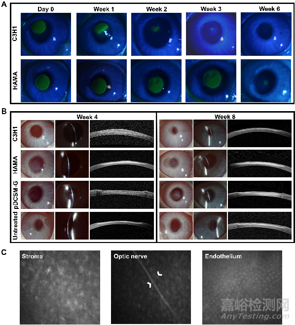 Fig. 6. Postoperative observation of the hydrogel treated corneas. (A) Representative photographs of cobalt blue with fluorescein staining in the rabbit experimental eyes filled with C3H1 and 1% HAMA hydrogels at different time points. The green area in the central cornea indicates the epithelial defect. (B) Representative slit lamp and AS-OCT images of the experimental eyes filled with C3H1 hydrogel, 1% HAMA hydrogel, 3% pDCSM-G, and the untreated eyes 4 and 8 weeks after surgery. (C) Confocal micrographs of the corneal stroma, optic nerve, and endothelium in the C3H1-hydrogel-filled cornea 8 weeks post-operation. White arrows point at the optic nerves of the posterior stroma.