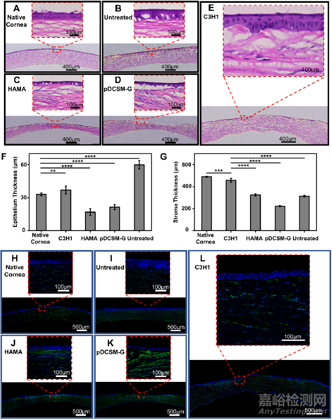 Fig. 7. Histological analysis of the hydrogel treated rabbit corneas eight weeks post-operation. Representative H&E images of (A) native corneas without defect, (B) corneas with untreated defect, and the defected corneas filled with (C) 1% HAMA hydrogel, (D) 3% pDCSM-G, and (E) C3H1 hydrogel. Quantification of (F) epithelium thickness and (G) stroma thickness according to the results from H&E staining. Representative images of immunofluorescence stained (H) native corneas without defect, (I) corneas with untreated defect, and the defected corneas filled with (J) 1% HAMA hydrogel, (K) 3% pDCSM-G, and (L) C3H1 hydrogel, using biomarkers α-SMA (green) and DAPI (blue). (*P<0.05, ****P<0.0001)