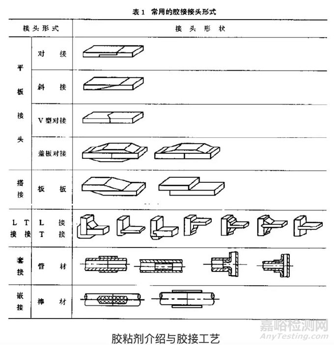 d.設計的膠接接頭應便于加工,表1是幾種常用的膠接接頭形式。