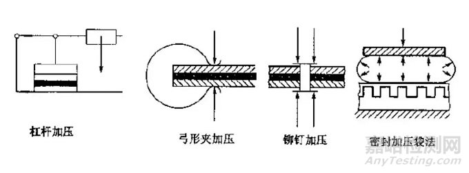 適中的壓力可很好地控制膠層厚度,充分發(fā)揮膠粘劑的膠接作用,保證膠層中無氣孔等。加壓的大小與膠粘劑及被膠接物的種類有關,對于脆性材料或加壓后易變形的塑料,壓力不易過大。一般情況下,對無溶劑膠粘劑比溶劑性膠粘劑加壓要??;對環(huán)氧樹脂膠粘劑,采用接觸壓力即可。圖5為常用的幾種加壓方法簡圖。