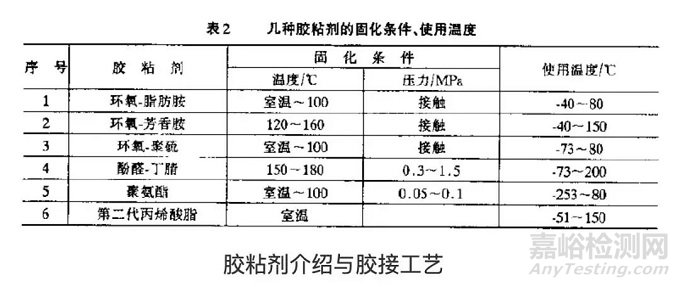 固化溫度與固化時間是相輔相成的,固化溫度越高,固化時間可短一些;固化溫度越低,固化時間應長一些。表2是幾種膠粘劑的固化條件、使用溫度。
