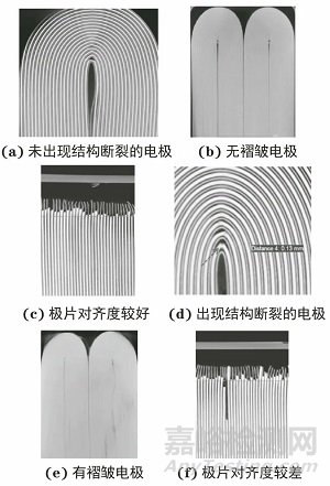 馬天翼等研究了微米級計算機(jī)斷層掃描技術(shù)(CT)在鋰離子電池內(nèi)部結(jié)構(gòu)分析中的應(yīng)用,分別對電極結(jié)構(gòu)斷裂、電極褶皺、極片整齊度進(jìn)行了測試其(檢測結(jié)果見圖3),可見CT成像結(jié)果可以對電池內(nèi)部電極的結(jié)構(gòu)斷裂、褶皺、電連接不穩(wěn)定以及正負(fù)極對齊度差等內(nèi)部結(jié)構(gòu)缺陷進(jìn)行識別。
