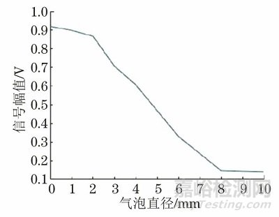 張曼針對鋰電池中是否存在空氣層缺陷的問題,采用空氣耦合超聲回執(zhí)穿透法對鋰離子電池進(jìn)行檢測,試驗設(shè)置采樣頻率為10 MHz,增益為33 dB,每組采集2584個點,采集若干組數(shù)據(jù),計算出的鋰電池空耦超聲透射波信號最大幅值隨氣泡缺陷直徑的變化曲線如圖5所示。