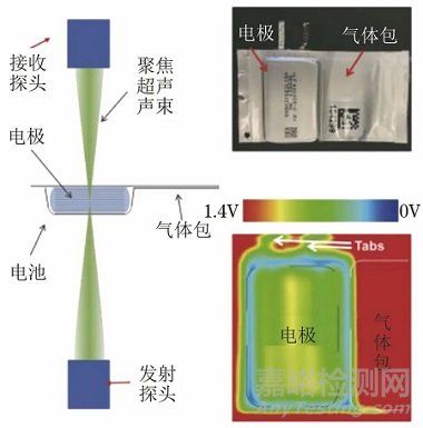 加拿大達(dá)爾豪斯大學(xué)的JEFF與華中科技大學(xué)的沈越等提出了一種基于超聲掃描技術(shù)研究軟包和棱柱型鋰離子電池的方法(聚焦超聲掃描的原理見圖7),利用直徑小于1 mm的聚焦超聲波束可實現(xiàn)亞毫米級分辨率的檢測。該方法通過超聲透射波束對電池內(nèi)部進(jìn)行原位無損檢測,可檢測電池內(nèi)部電解液老化損耗、電解液浸潤、固體電解質(zhì)界面生長、氣體分布等情況。