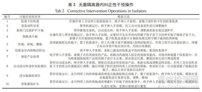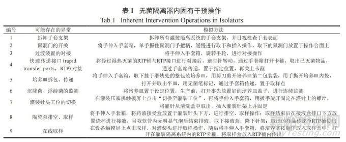 每批生產(chǎn)均會(huì)發(fā)生的、正常的、有計(jì)劃的生產(chǎn)工藝本身固有的干預(yù)操作匯總見(jiàn)表 1,包括無(wú)菌隔離器內(nèi)的環(huán)境監(jiān)測(cè)、過(guò)渡部位對(duì)接、在線稱(chēng)重、取樣等。糾正性干預(yù)操作 ( 即在生產(chǎn)過(guò)程中進(jìn)行糾正或調(diào)整的操作 ) 匯總見(jiàn)表 2,包括無(wú)菌隔離器使用過(guò)程中可能發(fā)生的情況,如倒瓶、炸瓶、碎瓶、傳感器異常和針頭調(diào)節(jié)等。
