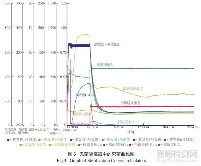 對(duì)無(wú)菌隔離器內(nèi)的固定設(shè)備和手套等采用異丙醇進(jìn)行噴霧和擦拭,以對(duì)其表面進(jìn)行清潔和消毒。無(wú)菌隔離器內(nèi)的灌裝壓塞機(jī)需進(jìn)行泄漏檢測(cè),檢測(cè)合格后,進(jìn)行在線高溫濕熱滅菌 (121 ℃,30 min)。隨后,將設(shè)備運(yùn)行過(guò)程中所需的輔助器具 ( 如不銹鋼條和培養(yǎng)皿等物品 ) 經(jīng)預(yù)處理后放置于無(wú)菌隔離器中。按無(wú)菌隔離器驗(yàn)證的裝載示意圖定點(diǎn)放置后,對(duì)無(wú)菌隔離器進(jìn)行泄漏測(cè)試,測(cè)試合格后,采用經(jīng)第三方機(jī)構(gòu)通過(guò)對(duì)無(wú)菌隔離器內(nèi)的過(guò)氧化氫濃度以及生物指示劑的挑戰(zhàn)驗(yàn)證得出的滅菌運(yùn)行參數(shù)( 預(yù)處理 10 min、充氣 15 min、保壓 40 min、通風(fēng)120 min) 進(jìn)行滅菌,通風(fēng)至過(guò)氧化氫濃度降至 10–6以下,然后對(duì)過(guò)氧化氫滅菌曲線與崗位標(biāo)準(zhǔn)操作規(guī)程模板曲線進(jìn)行審核,確保滅菌效果達(dá)到要求。過(guò)氧化氫滅菌曲線見(jiàn)如圖 3。