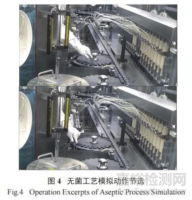 APS 過(guò)程在 C 級(jí)潔凈區(qū)背景下的無(wú)菌隔離器 A級(jí)潔凈區(qū)環(huán)境中進(jìn)行。操作人員按表 1 和表 2 所示模擬方法進(jìn)行干預(yù)操作,并記錄每項(xiàng)干預(yù)操作的次數(shù)和時(shí)間。整個(gè)過(guò)程通過(guò)攝像設(shè)備記錄,動(dòng)作節(jié)選如圖4所示,操作人員通過(guò)手套箱操作時(shí),動(dòng)作干凈、移動(dòng)緩慢且穩(wěn)健。
