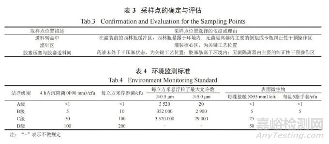 在 APS 全程中進(jìn)行沉降菌、浮游菌、懸浮粒子和表面微生物的監(jiān)測(cè)。沉降菌、浮游菌和懸浮粒子的采樣點(diǎn)確定與評(píng)估見(jiàn)表 3,監(jiān)測(cè)標(biāo)準(zhǔn)嚴(yán)格遵守GMP 規(guī)定 ( 見(jiàn)表 4)。