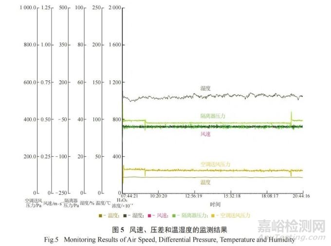 表面微生物的監(jiān)測(cè)除設(shè)備表面、無(wú)菌隔離器手套表面外,還包括人員監(jiān)測(cè) ( 如人員穿戴的潔凈服表面和人員佩戴的手套表面等 ),進(jìn)一步對(duì)人員在無(wú)菌隔離器內(nèi)的操作規(guī)范性進(jìn)行限制。監(jiān)測(cè)結(jié)果表明,整個(gè)模擬過(guò)程中微生物的污染水平未超過(guò)法規(guī)規(guī)定的限度,證明人員在無(wú)菌隔離器內(nèi)的操作不會(huì)對(duì)環(huán)境造成影響。除此之外,整個(gè)APS過(guò)程中,風(fēng)速、壓差和溫濕度等監(jiān)測(cè)結(jié)果均符合相關(guān)法規(guī)要求,監(jiān)測(cè)記錄曲線見(jiàn)圖 5。
