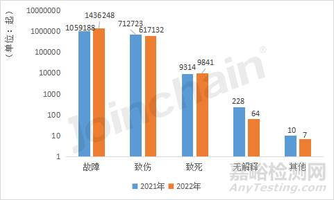 美國不良事件數(shù)據(jù)庫將不良事件的事件類型界定為:故障、致傷、致死、無解釋和其他,另有少量事件沒有劃分。據(jù)MDCLOUD(醫(yī)械數(shù)據(jù)云)統(tǒng)計,2022年美國不良事件占比最高的事件類型為故障事件,達69.61%,共發(fā)生1436248起;其次為致傷事件,共有617132起,占總數(shù)的29.91%;致死事件共發(fā)生了9841起,占0.48%;此外,還有71起不良事件為未解釋及其他事件類型。對比2021年,2022年美國不良事件的故障事件類型比例增長了約10%,致傷事件和致死事件類型占比有所減少,分別下降了10.1%和0.04%。