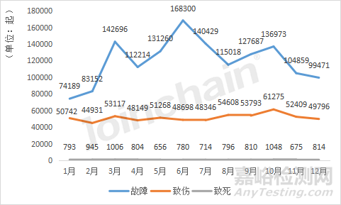 從2022年全年的事件類型數(shù)量變化來看,美國不良事件的致傷、致死事件數(shù)量變化相對較小,其中,10月份的致傷事件與致死事件最多,分別達到了61275起和1048起。故障事件數(shù)量變化存在波動,1月份事件數(shù)量為全年最低,為74189起,6月份達到單月最高,共168300起,上半年事件數(shù)呈波動上升趨勢,下半年逐步下降。