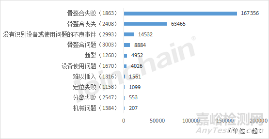 對根管重塑牙內(nèi)-骨內(nèi)種植體(DZE)的不良事件涉及的設備問題進行數(shù)量統(tǒng)計,排在前5的高頻設備問題分別為:“骨整合失敗(1863)”、“骨整合喪失(2408)”、“沒有識別設備或使用問題的不良事件(2993)”、“骨整合問題(3003)”、“斷裂(1260)”。提示該類產(chǎn)品的不良事件主要與種植體骨整合失敗、減弱或是與骨組織連接出現(xiàn)問題相關(guān)。