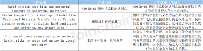 2022年加拿大不良數(shù)據(jù)庫披露了3起醫(yī)療器械不良事件,相比2021年(6起)有所減少,2022年披露的不良事件中涉及的產(chǎn)品有COVID-19 快速抗原檢測試劑盒、腹膜透析轉(zhuǎn)移裝置等,事件詳細內(nèi)容見表4。