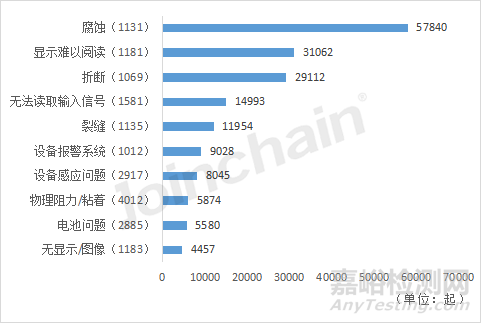 對輸液泵(FRN)的不良事件涉及的設備問題進行數(shù)量統(tǒng)計,排在前5的高頻設備問題分別為::“腐蝕(1131)”、“顯示難以閱讀(1181)”、“折斷(1069)”、“無法讀取輸入信號(1581)”、“裂縫(1135)”。提示該類產(chǎn)品的不良事件主要與產(chǎn)品不耐腐蝕,易折斷、破損等問題相關(guān)。