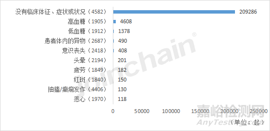 經(jīng)對這三類產(chǎn)品的不良事件涉及的患者問題進行數(shù)量統(tǒng)計,可以看到,三者最高頻的患者問題均為沒有臨床體征、癥狀或狀況(4582),尤其是血糖監(jiān)控系統(tǒng)與輸液泵,說明這兩類產(chǎn)品的不良事件大多數(shù)并未對患者造成傷害。種植體由于骨整合出現(xiàn)問題后,會導致種植體周圍纖維化,乃至植入失敗,造成患者出現(xiàn)疼痛等臨床反應。