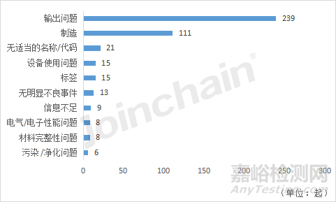 針對2022年不良事件數(shù)激增的嚴重急性呼吸綜合征相關(guān)冠狀病毒體外診斷試劑產(chǎn)品,對其不良事件中的事件故障類型進行統(tǒng)計,可以看到高頻的事件故障主要為:輸出問題(239起)、制造(111起)、無適當?shù)拿Q/代碼(21起)、設備使用問題(15起)和標簽(15起)。