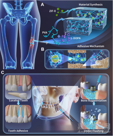 近日,重慶醫(yī)科大學(xué)附屬口腔醫(yī)院陳陶教授/季平教授/胡杉杉副研究員團(tuán)隊(duì)設(shè)計(jì)并構(gòu)建了一種貽貝來源的超強(qiáng)骨膠,可通過直接注射或者混合異種骨顆粒等方式進(jìn)行使用,短時(shí)間內(nèi)呈現(xiàn)出強(qiáng)力的組織界面粘接效果。該骨膠由生物安全性良好的聚乙烯醇(PVA)聚合物作為長鏈結(jié)構(gòu),共價(jià)結(jié)合海洋貽貝啟發(fā)的左旋多巴(L-DOPA),使用ZIF-8納米顆粒進(jìn)行生物功能化,形成高度集成的金屬-兒茶酚胺配位結(jié)構(gòu)。一方面,ZIF-8和L-DOPA的鄰苯二酚在納米水平上的鍵合,通過機(jī)械強(qiáng)度的提高,使其能夠與骨組織產(chǎn)生強(qiáng)烈的粘附作用(搭接剪切強(qiáng)度達(dá)到了10 MPa);另一方面,ZIF-8中Zn2+的可控和持續(xù)釋放使其在骨創(chuàng)愈合的生理過程中呈現(xiàn)出良好的應(yīng)用前景。