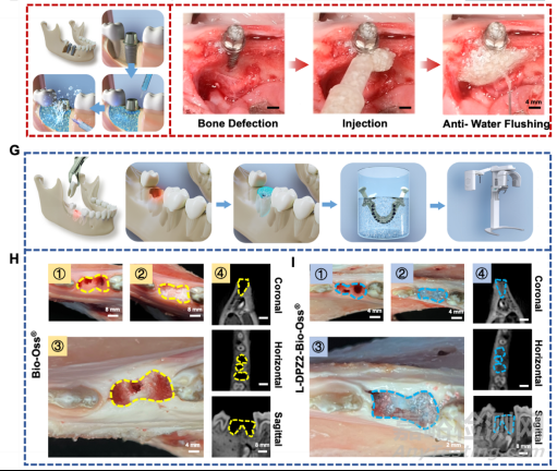 除此以外,與長骨粉碎性骨折相比,因腫瘤、外傷及感染等引起的頜面骨缺損,由于其復(fù)雜的幾何輪廓以及特殊的咀嚼功能,為臨床手術(shù)帶來了極大的挑戰(zhàn),患者常常面臨精神和身體上的雙重負(fù)擔(dān)[9]。為了重建創(chuàng)傷后理想的骨輪廓,引導(dǎo)骨再生(GBR)是解決這一問題的有效且廣泛應(yīng)用的方法。最常用的骨缺損再生支架材料是異種骨替代材料,如Bio-Oss®[10]。但由于這類骨移植物內(nèi)聚性差,術(shù)中持續(xù)出血及術(shù)后生理活動(dòng)常導(dǎo)致骨缺損部位Bio-Oss®顆粒滲漏移位,最終影響手術(shù)效果。因此,鑒于該超級(jí)骨膠的優(yōu)異粘附性,我們將常用的異種骨代物Bio-Oss®顆粒與之混合,通過種植體周骨缺損GBR手術(shù)以及拔牙窩位點(diǎn)保存手術(shù),評(píng)估了該復(fù)合材料在骨增量手術(shù)中中Bio-Oss®空間維持中的潛在適用性(詳見圖4)。