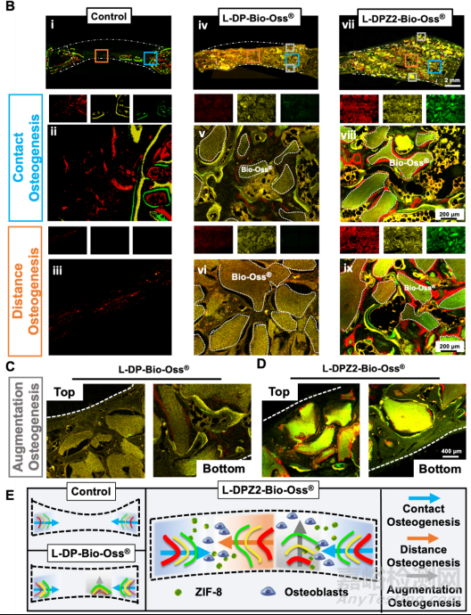 由于骨替代材料Bio-Oss®僅具備骨傳導(dǎo)性而缺乏骨誘導(dǎo)作用,通常會(huì)造成機(jī)體自身新骨長入的延宕。而ZIF-8在細(xì)胞內(nèi)外釋放的Zn2+通過經(jīng)典MAPK途徑促進(jìn)rBMSC成骨分化的能力,賦予了超級(jí)骨膠活躍的骨誘導(dǎo)性。通過新西蘭兔顱頂骨缺損骨增量模型,作者證實(shí)了該骨膠通過接觸成骨、距離成骨及增量性成骨三種模式,在短期內(nèi)全方位實(shí)現(xiàn)了骨替代材料Bio-Oss®的內(nèi)化(詳見圖5)。