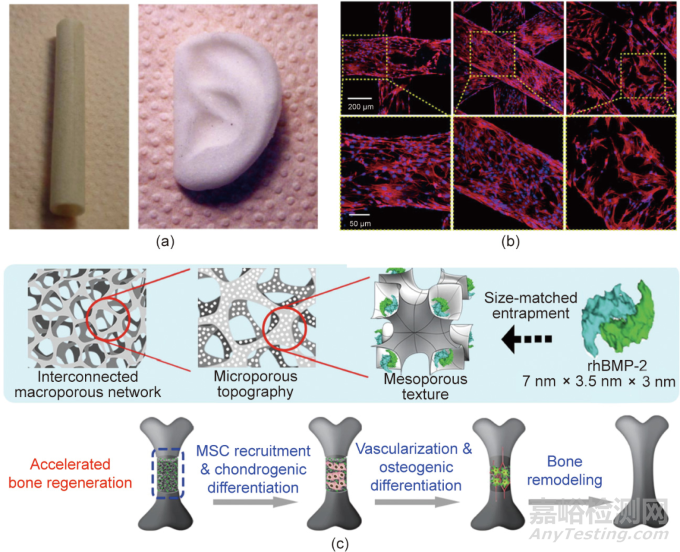 圖2. 組織工程支架研究的部分典型進展。(a)室溫注射/顆粒浸出法(RTIM/PL)制備的管狀和耳狀PLGA多孔支架的全局視圖;(b)骨髓間充質(zhì)干細胞在3D打印的聚乳酸支架上培養(yǎng)7天后的熒光顯微圖像,支架結(jié)構(gòu)從左到右依次為四方、六方和車輪狀結(jié)構(gòu);(c)負載了重組人骨形態(tài)發(fā)生蛋白rhBMP-2的多孔支架加速骨再生的示意圖。
