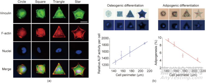圖3. 利用材料表面微圖案控制單細胞形狀和研究細胞形狀對干細胞分化的影響。(a)接枝RGD的不同形狀的微米島上的單細胞熒光顯微圖;(b)通過材料表面圖案化控制單細胞黏附研究其對干細胞分化的影響。ALP為堿性磷酸酶,比例尺為25 μm。